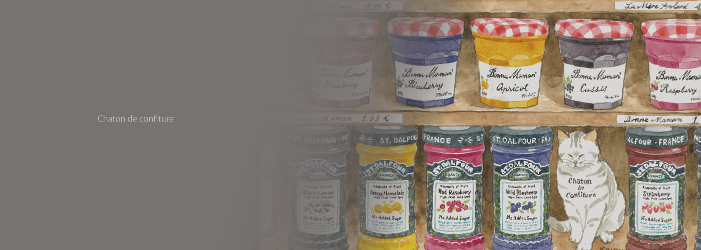"Assortiment de Petits Fours Secs(焼き菓子の詰め合わせ)"焼き菓子に囲まれて至福の時を過ごす猫を描きました。