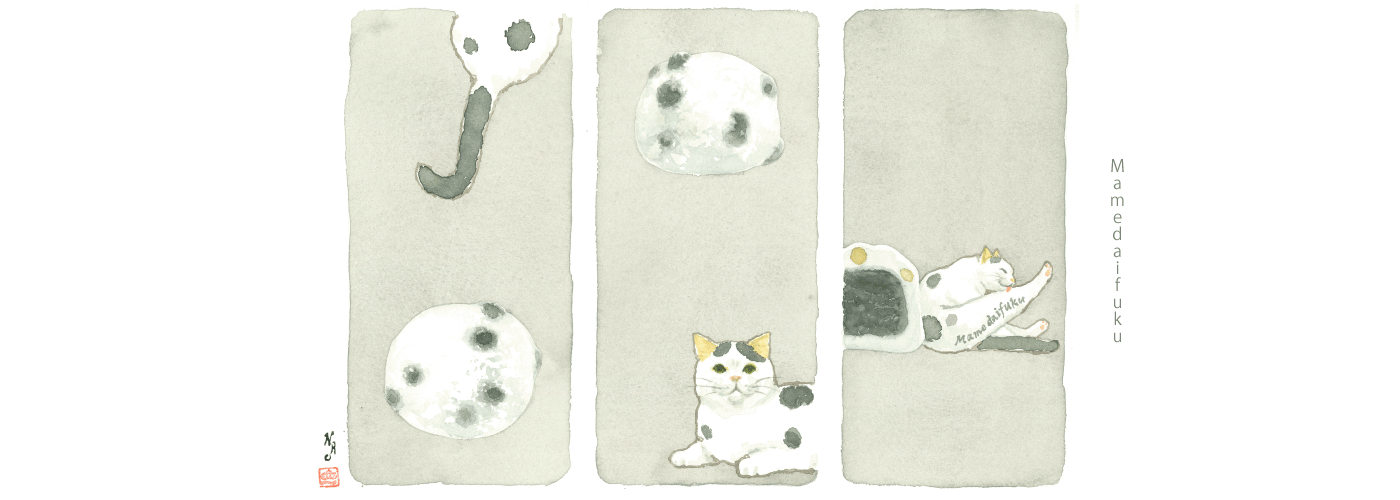 "WAGASHI(和菓子)"和菓子に囲まれて至福の時を過ごす猫を描きました。